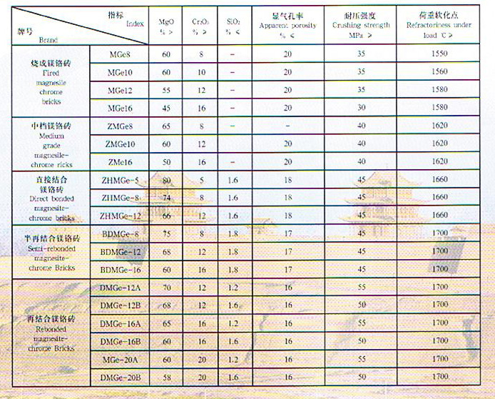 鎂鉻磚:是以燒結(jié)鎂砂和氧化鉻為原料經(jīng)高壓成型、高溫?zé)芍频茫哂袩崤蛎浵禂?shù)小、抗熱震性能好,抗渣性強等特點,廣泛用于水泥窯、有色冶金爐、玻璃窯蓄熱室等各種工業(yè)窯爐。