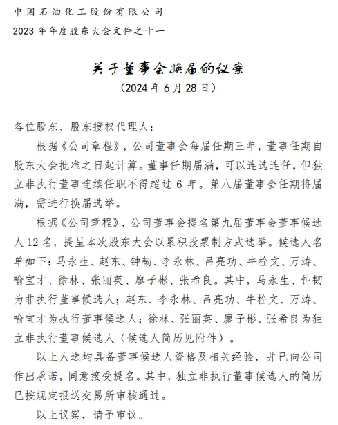 近日,中國石化發(fā)布公告,將對公司董事會進行換屆,第九屆董事會候選人名單如下:馬永生、趙東、鐘韌、李永林、呂亮功、牛栓文、萬濤、 喻寶才、徐林、張麗英、廖子彬、張希良。