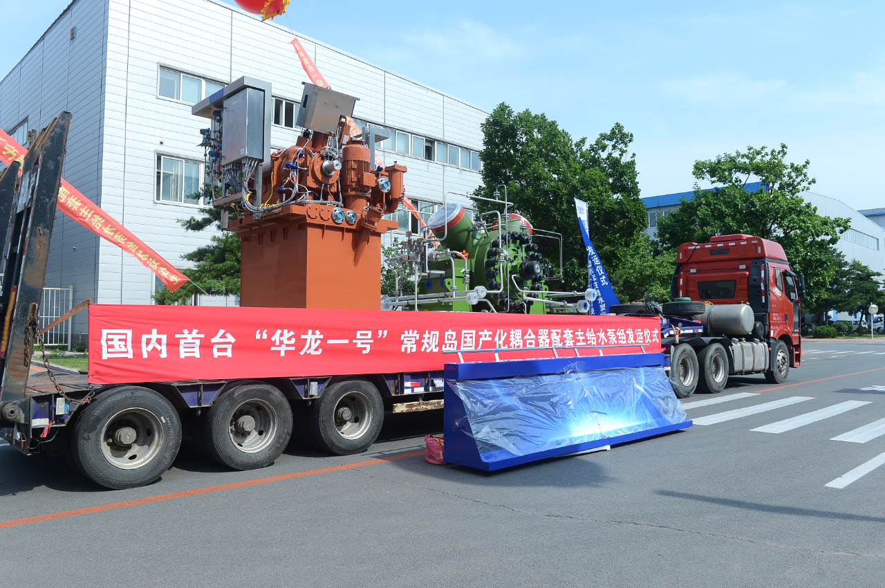 圖為華龍一號國產(chǎn)化耦合器主給水泵組發(fā)運現(xiàn)場