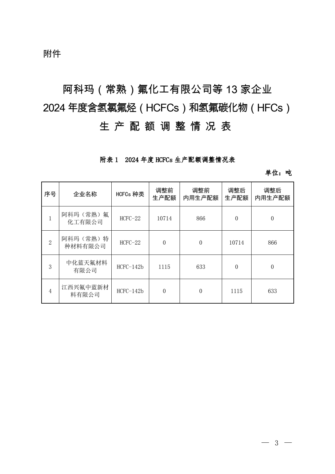 關(guān)于同意阿科瑪(常熟)氟化工有限公司等13家企業(yè)2024年度含氫氯氟烴和氫氟碳化物生產(chǎn)配額調(diào)整的復(fù)函
