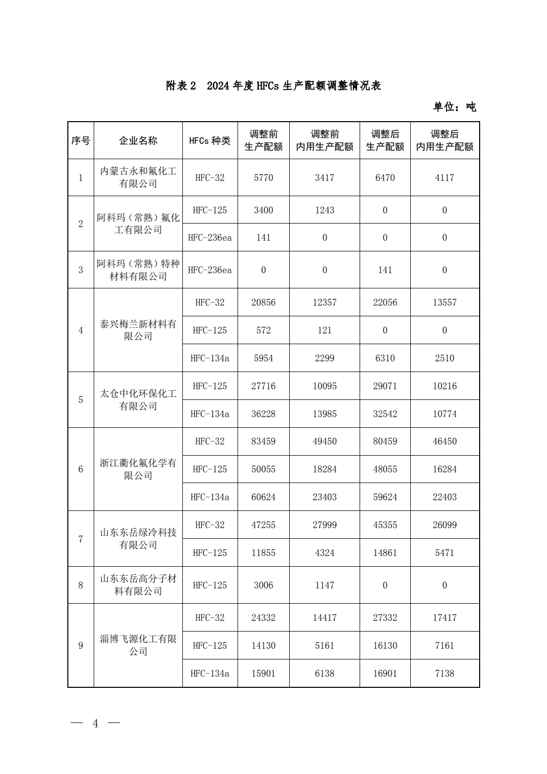 附件:阿科瑪(常熟)氟化工有限公司等13家企業(yè)2024年度含氫氯氟烴(HCFCs)和氫氟碳化物(HFCs)生產(chǎn)配額調(diào)整情況表