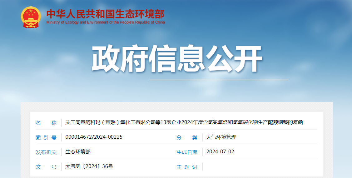 7月2日,生態(tài)環(huán)境部發(fā)布關(guān)于同意阿科瑪(常熟)氟化工有限公司等13家企業(yè)2024年度含氫氯氟烴和氫氟碳化物生產(chǎn)配額調(diào)整的復(fù)函。