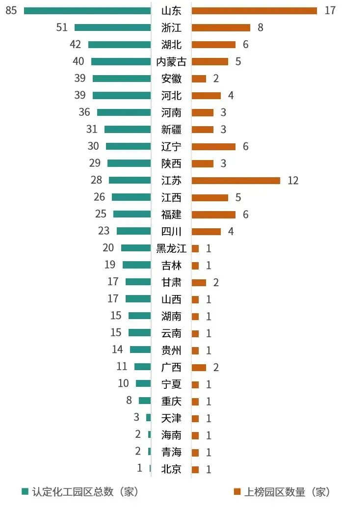 部分省(市、區(qū))認定化工園區(qū)總數(shù)與百強園區(qū)數(shù)量對比圖