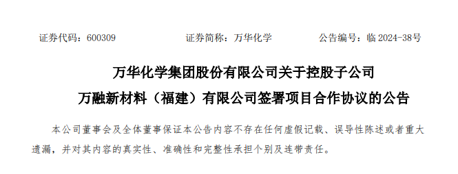 公告稱,《項目合作協(xié)議》目前僅為原則性框架性協(xié)議,后續(xù)合作事宜尚需進一步明確。此次合作協(xié)議的簽署,是萬華化學在高端新材料領(lǐng)域邁出的重要一步。