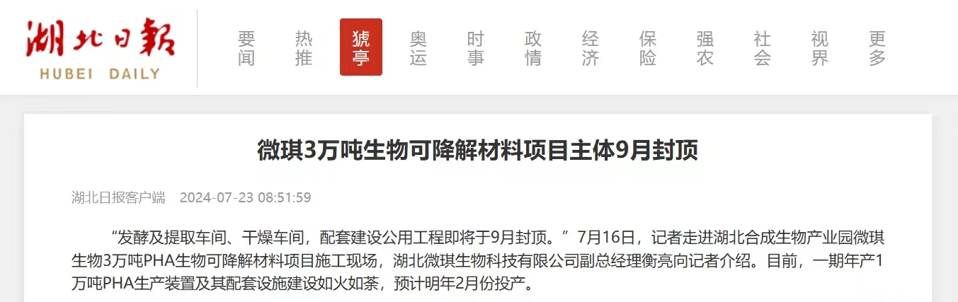 7月23日,據湖北日報消息,湖北合成生物產業(yè)園微琪生物3萬噸/年PHA項目主體9月封頂,一期年產1萬噸PHA生產裝置預計明年2月份投產。