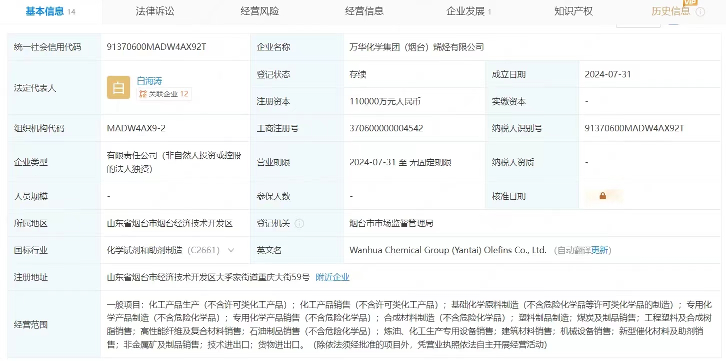 企查查APP顯示,近日,萬華化學(xué)集團(tuán)(煙臺(tái))烯烴有限公司成立,法定代表人為白海濤,注冊(cè)資本11億元。