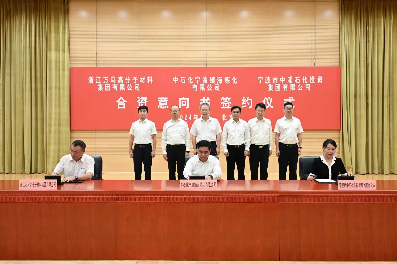 2024年8月8日,中石化寧波鎮(zhèn)海煉化有限公司與浙江萬馬高分子材料集團有限公司、寧波市中浦石化投資集團有限公司,在北京舉辦《合資意向書》簽約儀式。