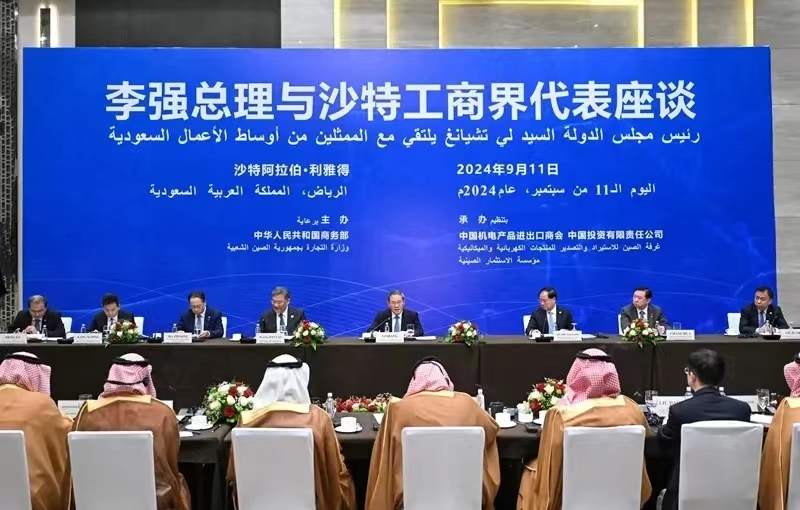 當(dāng)?shù)貢r(shí)間9月11日上午,國務(wù)院總理李強(qiáng)在利雅得同沙特工商界代表座談交流。新華社記者 饒愛民 攝