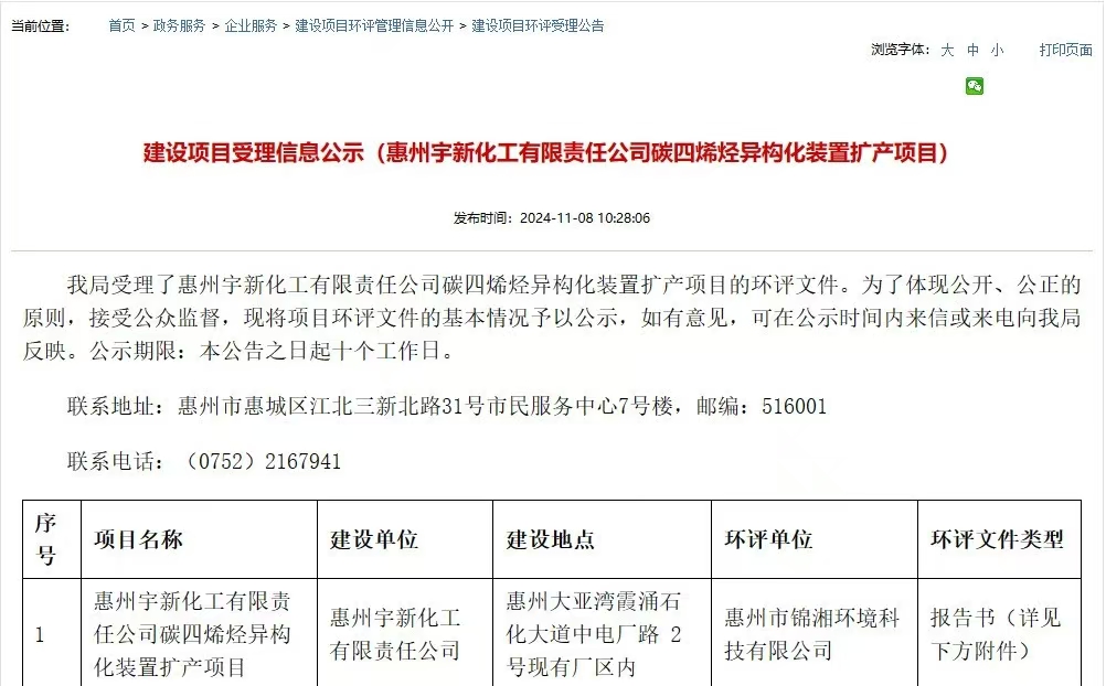 11月8日,惠州市生態(tài)環(huán)境局對惠州宇新化工有限責任公司碳四烯烴異構化裝置擴產(chǎn)項目進行受理公示: