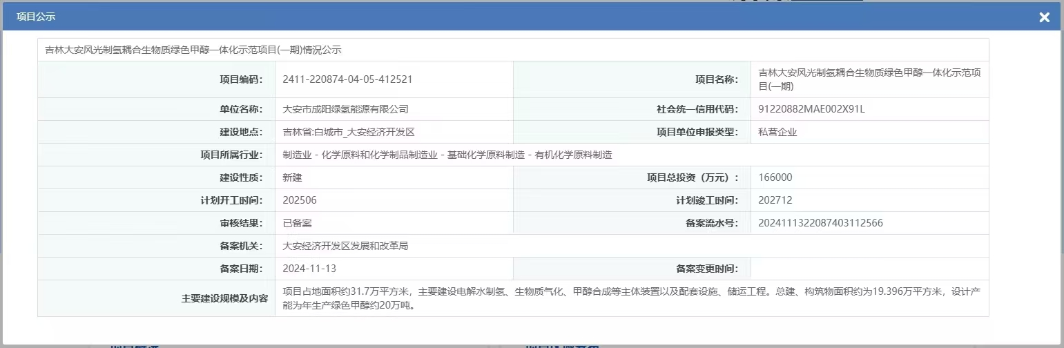 11月13日,吉林大安風(fēng)光制氫耦合生物質(zhì)綠色甲醇一體化示范項(xiàng)目(一期)獲備案。