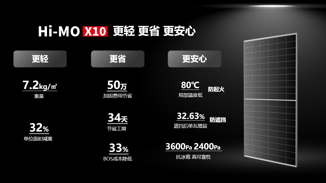 Hi-MO X10輕質(zhì)雙防組件的上市,成功解決了低載荷屋頂建設(shè)光伏電站的需求,并降低了安裝成本和提升了電站安全性,通過場景化產(chǎn)品開發(fā),為更多業(yè)主提供差異化服務(wù),助力中國“雙碳”事業(yè)。