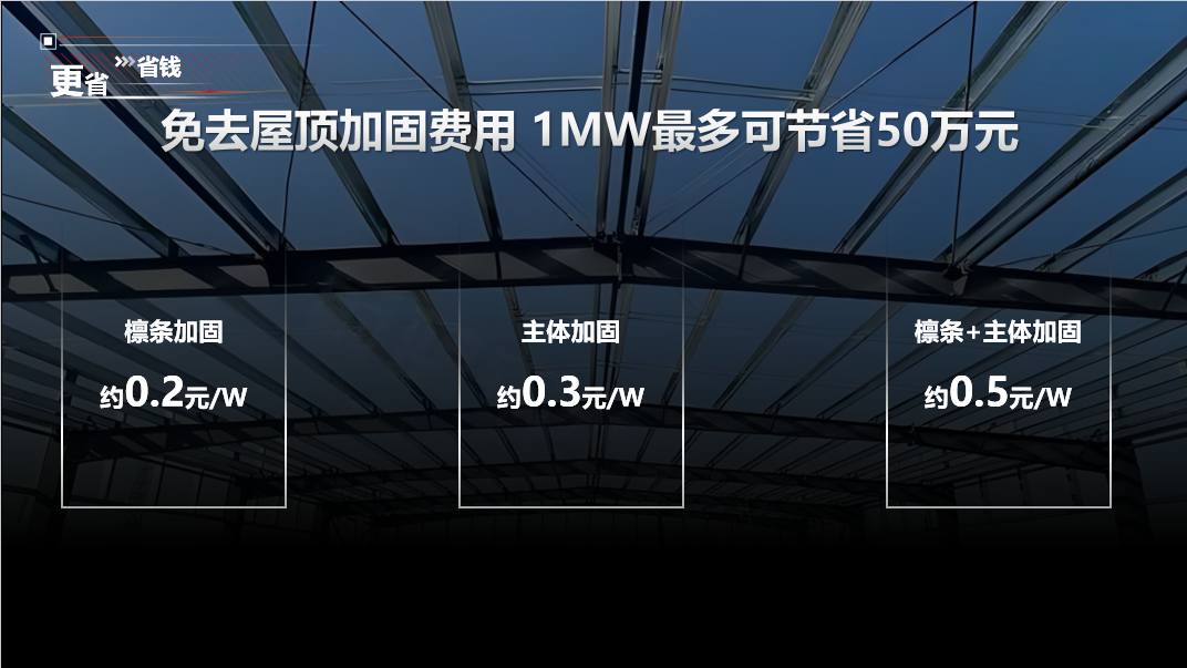 更?。菏〖庸藤M(fèi)、省BOS成本,省工期。以前的老舊廠房沒有預(yù)留光伏荷載,這類屋頂如果要建設(shè)光伏電站,就需要加固改造,提高其承重能力。但是,一方面企業(yè)加固屋頂費(fèi)用高昂,建筑物“主體+檁條”的加固成本更是高達(dá)0.5元/W,以1萬平方米的屋頂計(jì)算,大約需要50萬的加固成本。
