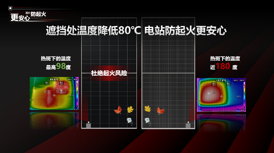 “防遮擋和防起火”雙防功能。Hi-MO X10輕質(zhì)雙防組件因?yàn)椴捎肏PBC 2.0技術(shù),還具備了“防遮擋”和“防起火”功能。