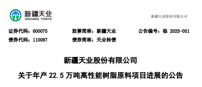 7月17日,新疆天業(yè)發(fā)布公告稱(chēng),公司開(kāi)發(fā)行可轉(zhuǎn)換公司債券募集資金投資項(xiàng)目——年產(chǎn)22.5萬(wàn)噸高性能樹(shù)脂原料項(xiàng)目,由公司全資子公司新疆天業(yè)匯祥新材料有限公司建設(shè)實(shí)施,該項(xiàng)目近日成功打通全流程,順利產(chǎn)出高性能樹(shù)脂原料,對(duì)推動(dòng)公司進(jìn)一步實(shí)現(xiàn)綠色低碳可持續(xù)發(fā)展具有重要意義。