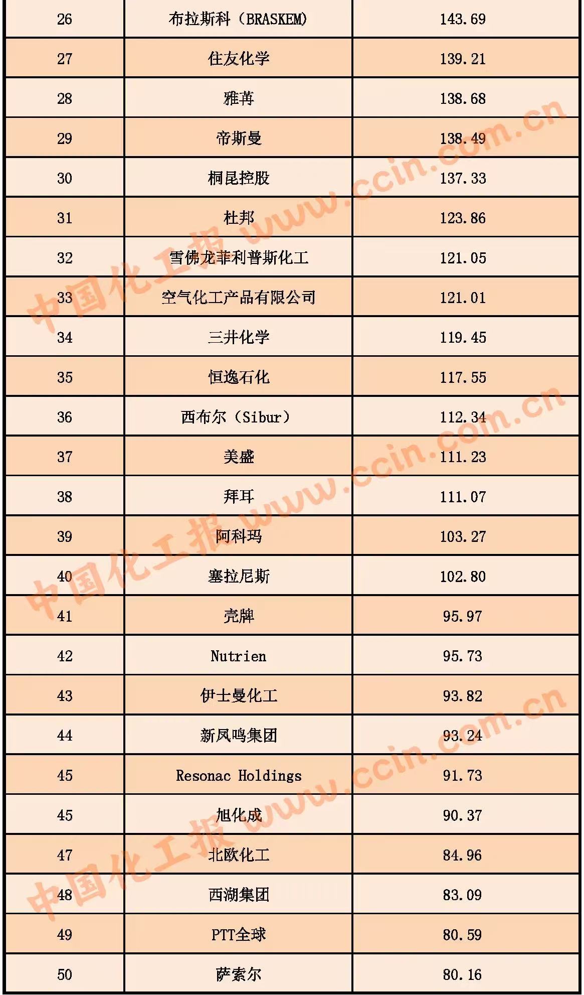 今年上榜的中國化工企業(yè)依舊是去年的老面孔,除中國石化、中國石油外,臺塑排名第11位,中國中化旗下的先正達排第13位,榮盛石化排第14位,萬華化學排第15位,恒力石化排第18位,東方盛虹排第23位,桐昆控股排第30位,恒逸石化排第35位,新鳳鳴集團排第44位。其中,中國石油、萬華化學、桐昆控股、新鳳鳴等排名有所上升。