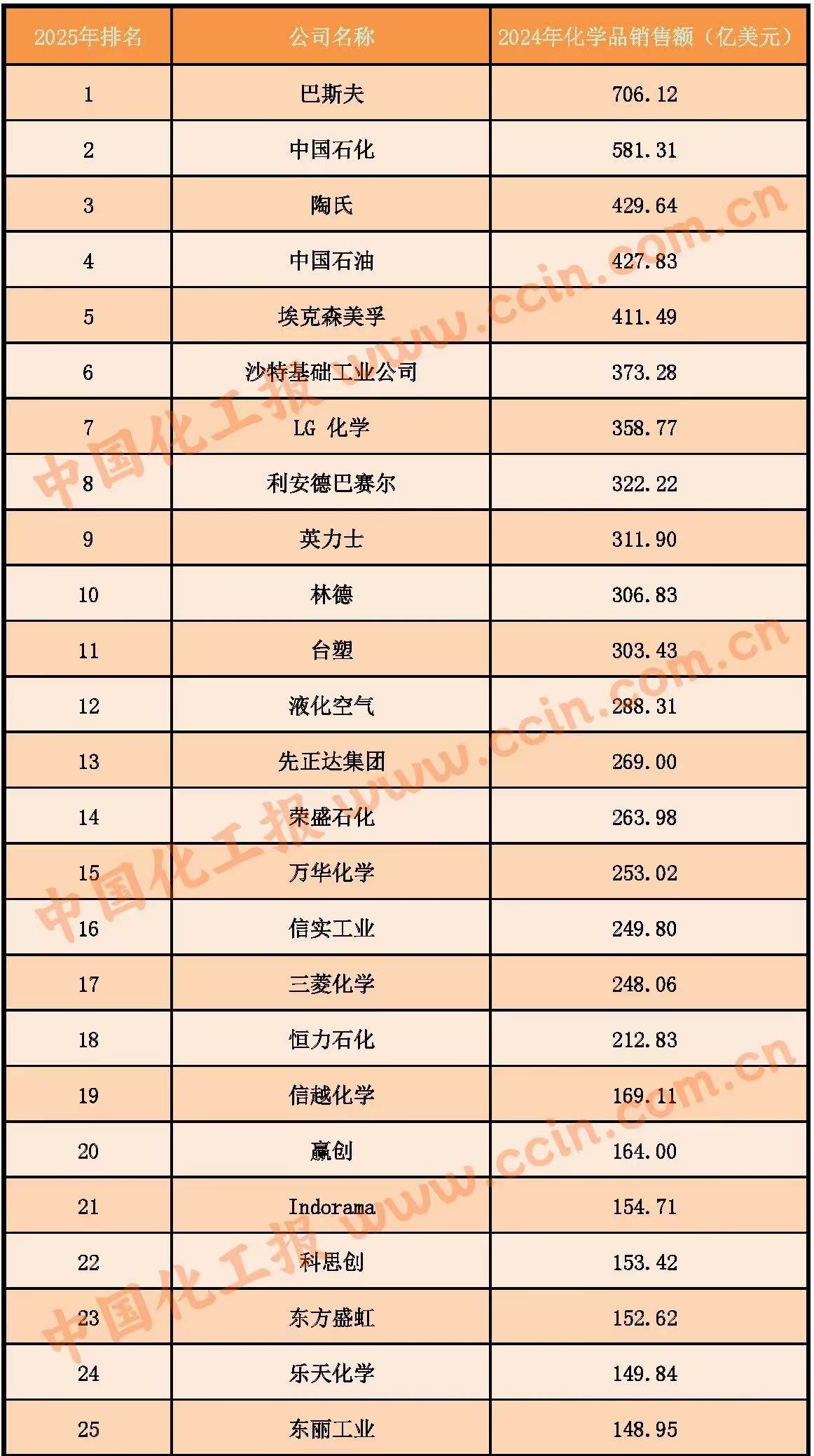 7月22日,美國《化學與工程新聞》(C&EN)公布“2025年全球化工企業(yè)50強”。巴斯夫、中國石化、陶氏依舊穩(wěn)居前三甲,中國石油升至第四位,與陶氏差距不到2億美元。中國企業(yè)有11家上榜,數(shù)量與上年持平。