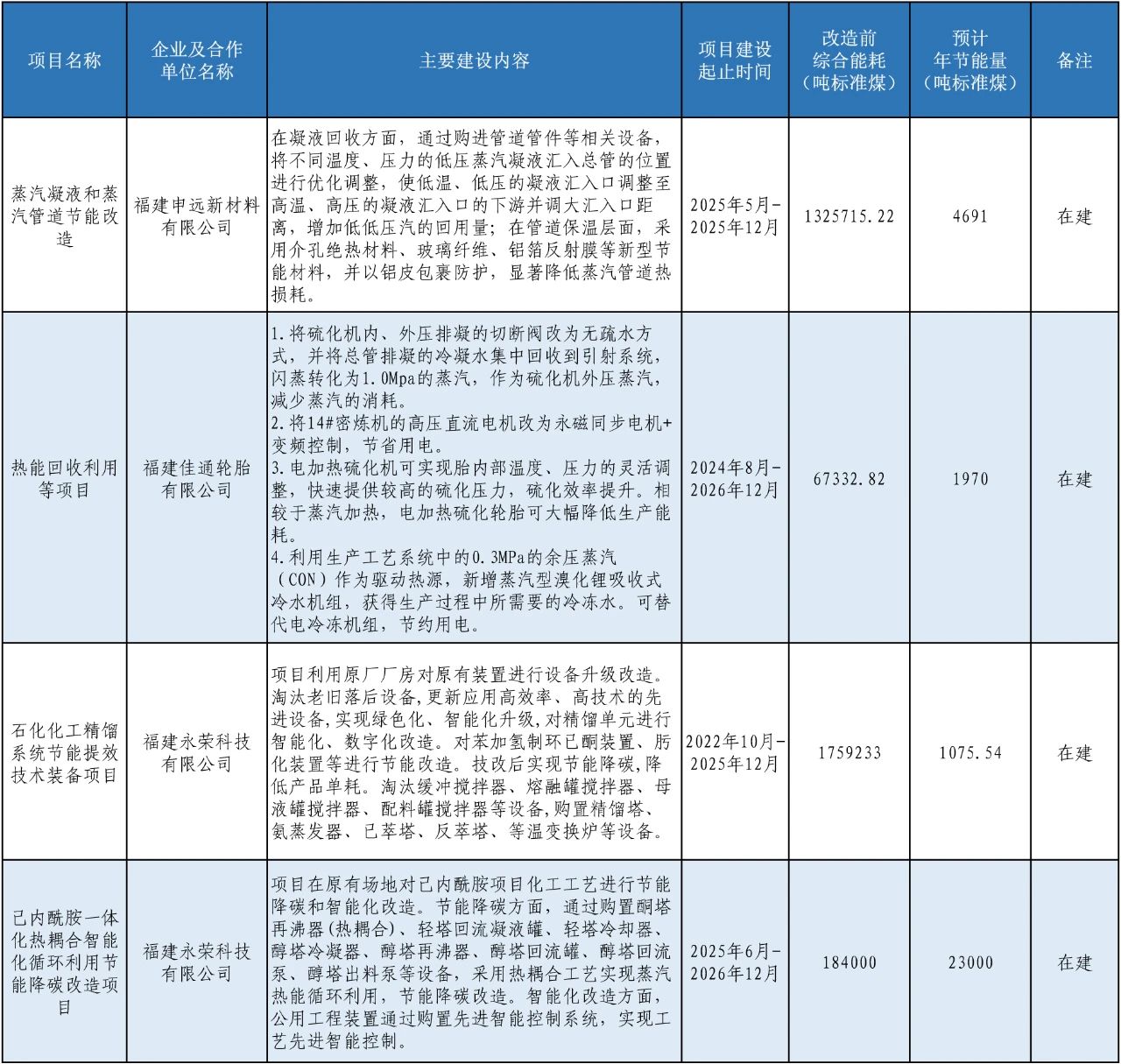 值得關(guān)注的是,25個(gè)項(xiàng)目中,有4個(gè)涉化項(xiàng)目。分別是:福建申遠(yuǎn)新材料有限公司蒸汽凝液和蒸汽管道節(jié)能改造項(xiàng)目、福建佳通輪胎有限公司熱能回收利用項(xiàng)目、福建永榮科技有限公司石化化工精餾系統(tǒng)節(jié)能提效技術(shù)裝備項(xiàng)目以及己內(nèi)酰胺一體化熱耦合智能化循環(huán)利用節(jié)能降碳改造項(xiàng)目。