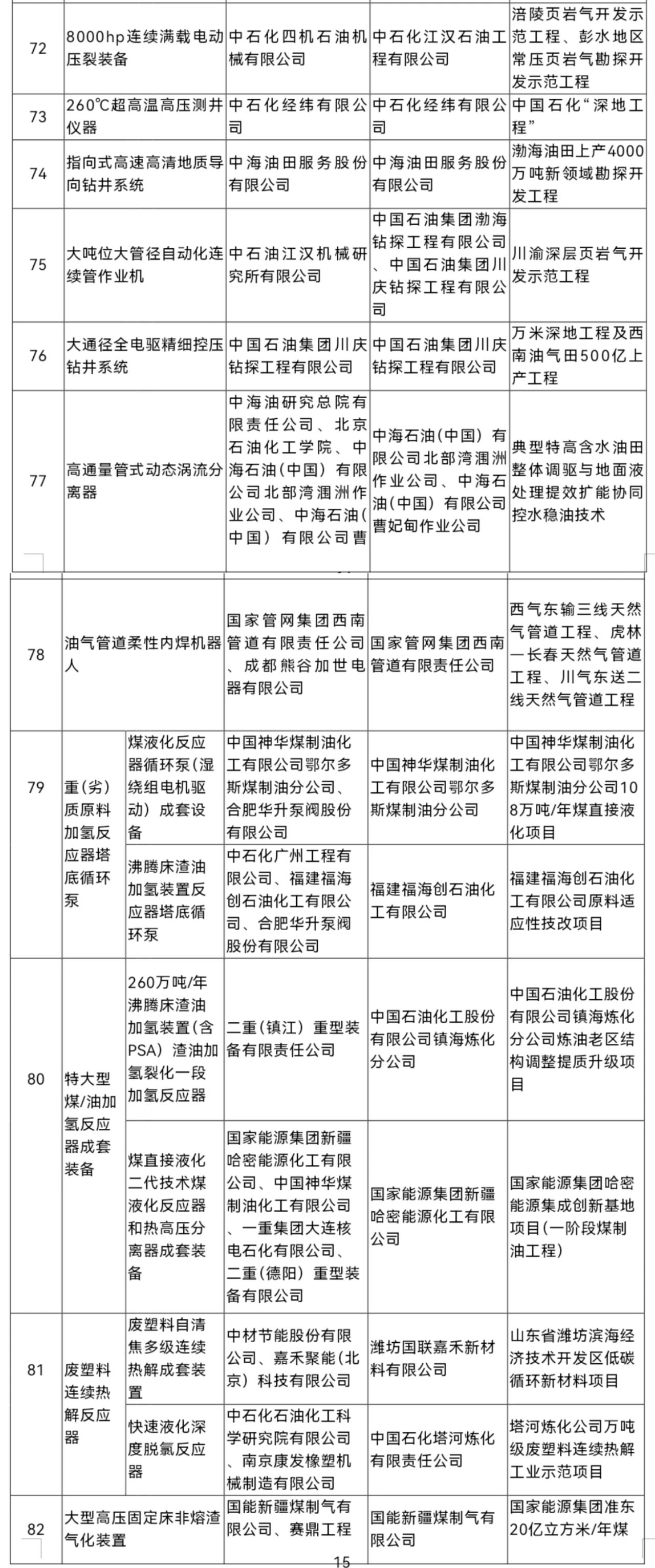 其中,在能源化工領(lǐng)域,中石化、中石油、中海油、國家能源集團(tuán)等企業(yè)的多臺(tái)套技術(shù)裝備入圍名單。具體見下表: