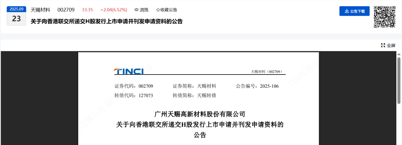 廣州天賜高新材料股份有限公司已于9月22日向香港聯合交易所有限公司遞交了首次公開發(fā)行H股股票并在香港聯交所主板上市的申請,并于同日在香港聯交所網站刊登了本次發(fā)行的申請材料。該申請材料為草擬版本,其所載資料可能會適時作出更新及修訂。
