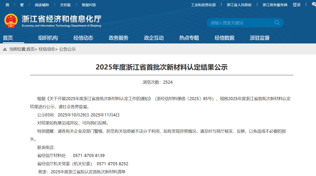 根據(jù)《關(guān)于開展2025年度浙江省首批次新材料認定工作的通知》(浙經(jīng)信材料便函〔2025〕85號),現(xiàn)將2025年度浙江省首批次新材料認定結(jié)果進行公示,請社會各界監(jiān)督。