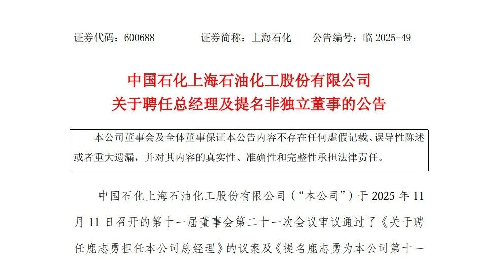 中國(guó)石化上海石油化工股份有限公司(下稱“本公司”)于2025年11月11日召開的第十一屆董事會(huì)第二十一次會(huì)議審議通過(guò)了《關(guān)于聘任鹿志勇?lián)伪竟究偨?jīng)理》的議案及《提名鹿志勇為本公司第十一屆董事會(huì)非獨(dú)立董事候選人》的議案。