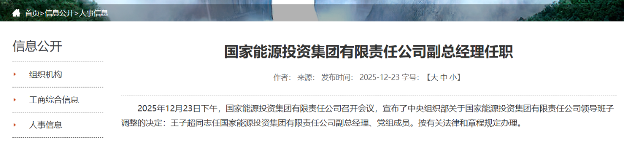 12月23日,據(jù)國(guó)家能源集團(tuán)官網(wǎng)消息,國(guó)家能源投資集團(tuán)有限責(zé)任公司召開會(huì)議,宣布了中央組織部關(guān)于國(guó)家能源投資集團(tuán)有限責(zé)任公司領(lǐng)導(dǎo)班子調(diào)整的決定:王子超同志任國(guó)家能源投資集團(tuán)有限責(zé)任公司副總經(jīng)理、黨組成員。按有關(guān)法律和章程規(guī)定辦理。