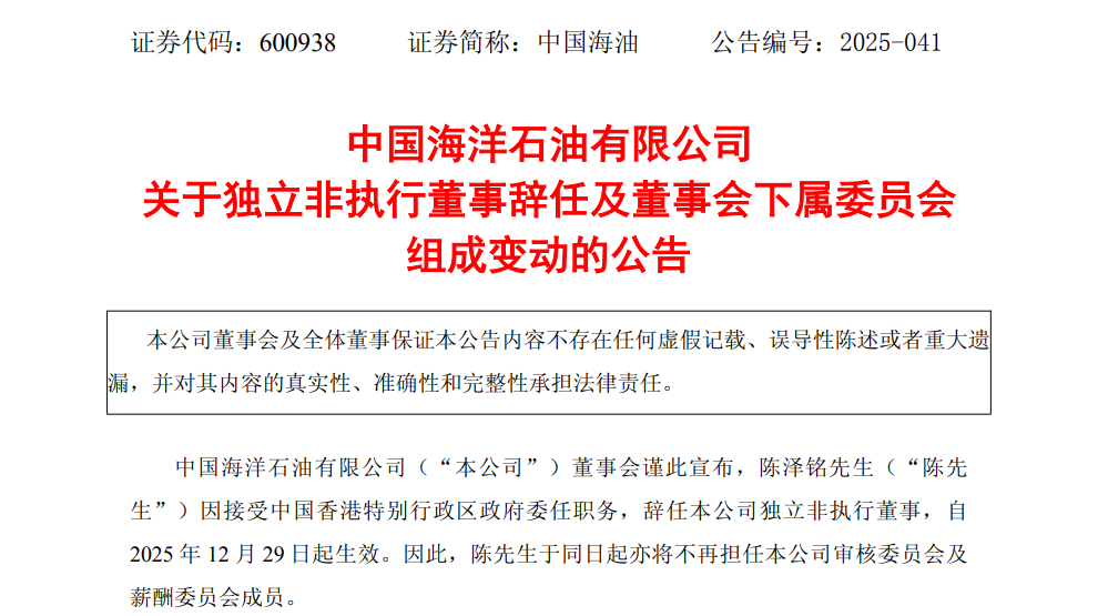 2025年12月29日,中國海油發(fā)布公告稱,陳澤銘先生因接受中國香港特別行政區(qū)政府委任職務(wù),辭任中國海油獨立非執(zhí)行董事,自2025年12月 29日起生效。