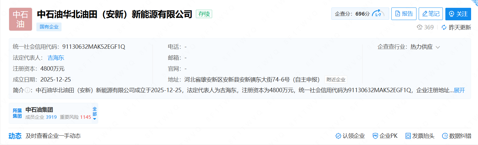 近日,中石油華北油田(安新)新能源有限公司成立。企查查股權(quán)穿透顯示,該公司由中國石油全資子公司中石油太湖(北京)投資有限公司、安新縣公共服務(wù)管理集團(tuán)有限公司共同持股。