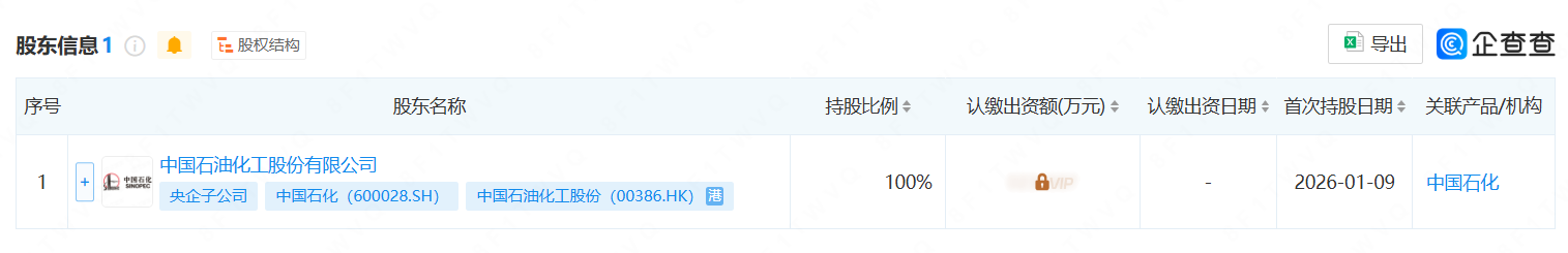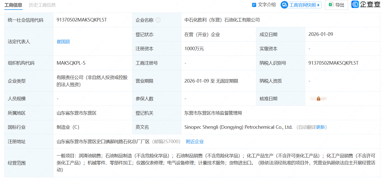 據(jù)企查查顯示,1月9日,中石化勝利(東營)石油化工有限公司成立,法定代表人為崔國居,注冊資本為1000萬元。股東信息顯示,該公司由中國石化全資持股。