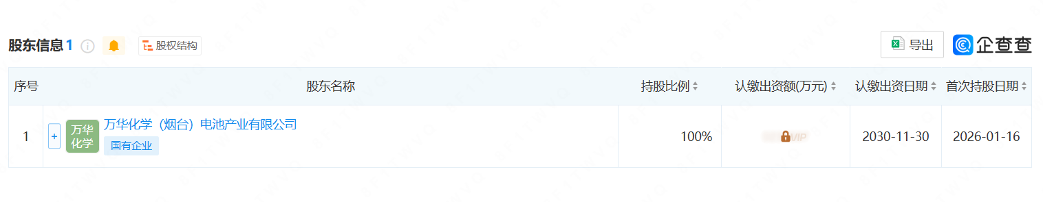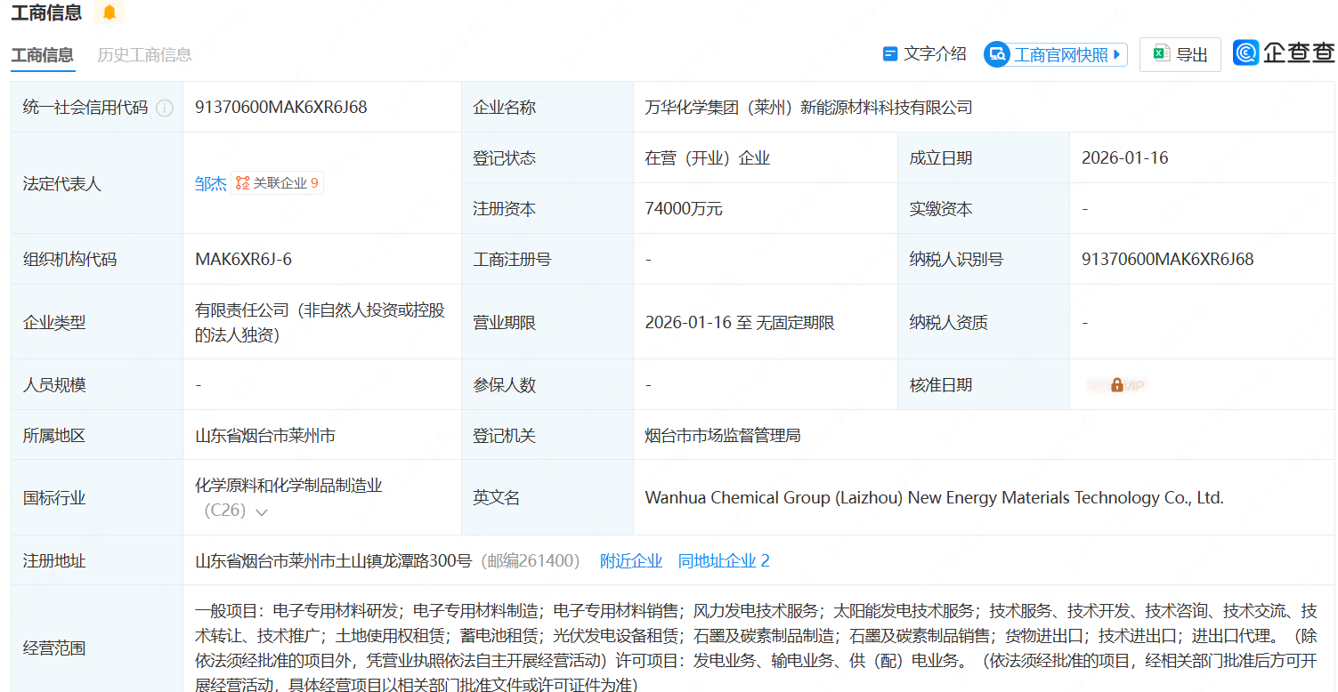 1月16日,萬華化學(xué)集團(tuán)(萊州)新能源材料科技有限公司成立。該公司注冊資本7.4億元,由萬華化學(xué)(煙臺)電池產(chǎn)業(yè)有限公司全資持股。