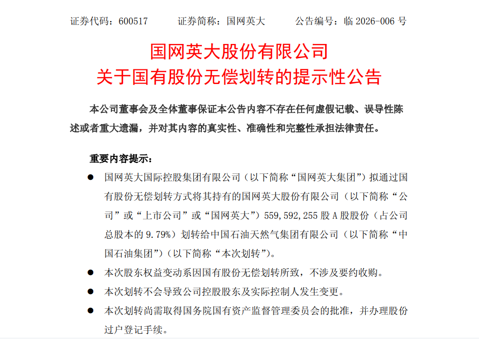 3月28日,國網(wǎng)英大股份有限公司發(fā)布關(guān)于國有股份無償劃轉(zhuǎn)的提示性公告。國網(wǎng)英大集團(tuán)擬通過國有股份無償劃轉(zhuǎn)方式將其持有的國網(wǎng)英大股份有限公司559,592,255股A股股份(占公司總股本的9.79%)劃轉(zhuǎn)給中國石油天然氣集團(tuán)有限公司。
