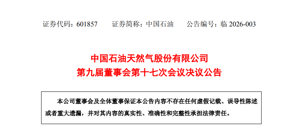 3月30日,中國石油天然氣股份有限公司發(fā)布第九屆董事會第十七次會議決議公告。其中審議通過《關(guān)于公司董事會換屆的議案》。經(jīng)董事會提名委員會審議通過,董事會同意推薦戴厚良、周心懷、段良偉、周松、任立新、謝軍、張道偉、宋大勇、何敬麟、閻焱、劉曉蕾、張玉新、吳嘉寧為第十屆董事會董事候選人,其中何敬麟、閻焱、劉曉蕾、張玉新、吳嘉寧為獨立董事候選人。