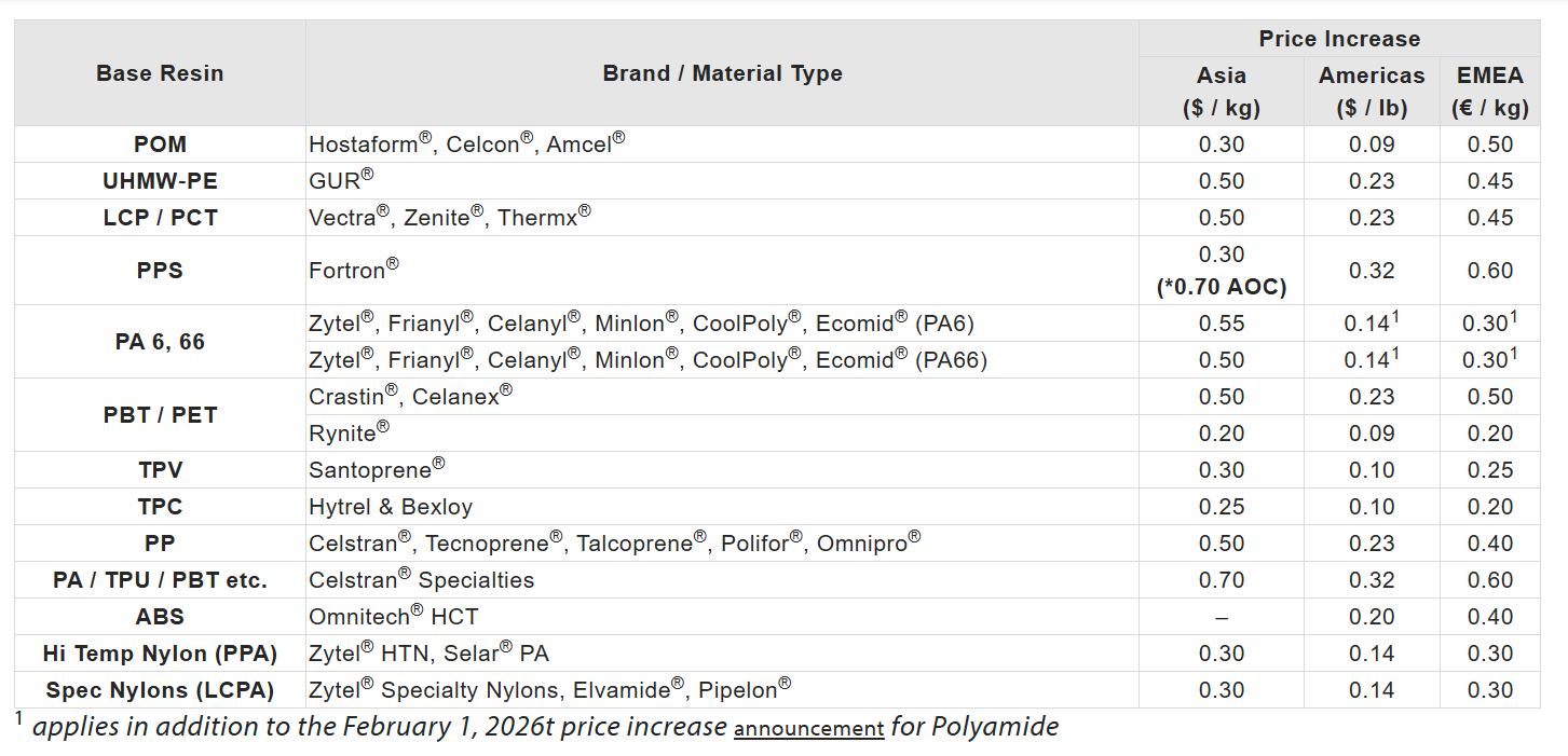 (6)塞拉尼斯上調(diào)一系列工程塑料產(chǎn)品價格,涉及POM、UHMW-PE、LCP、PCT、PPS、PA6,66、PBT/PET、TPV、TPC、PP、PA/TPU/PBT、ABS、高溫尼龍PPA、特種尼龍(LCPA)等(部分牌號的價格漲幅可能高于下表所述),如下: