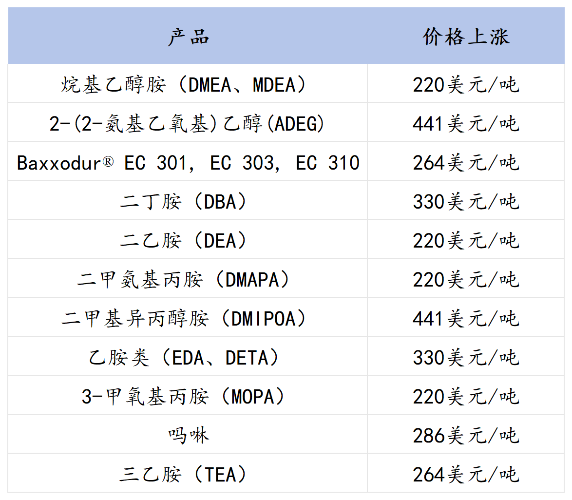 值得一提的是,巴斯夫4月起多輪提價:將于2026年4月6日起(或現(xiàn)有合同允許的情況下)上調(diào)其在北美地區(qū)以下胺類產(chǎn)品的價格。