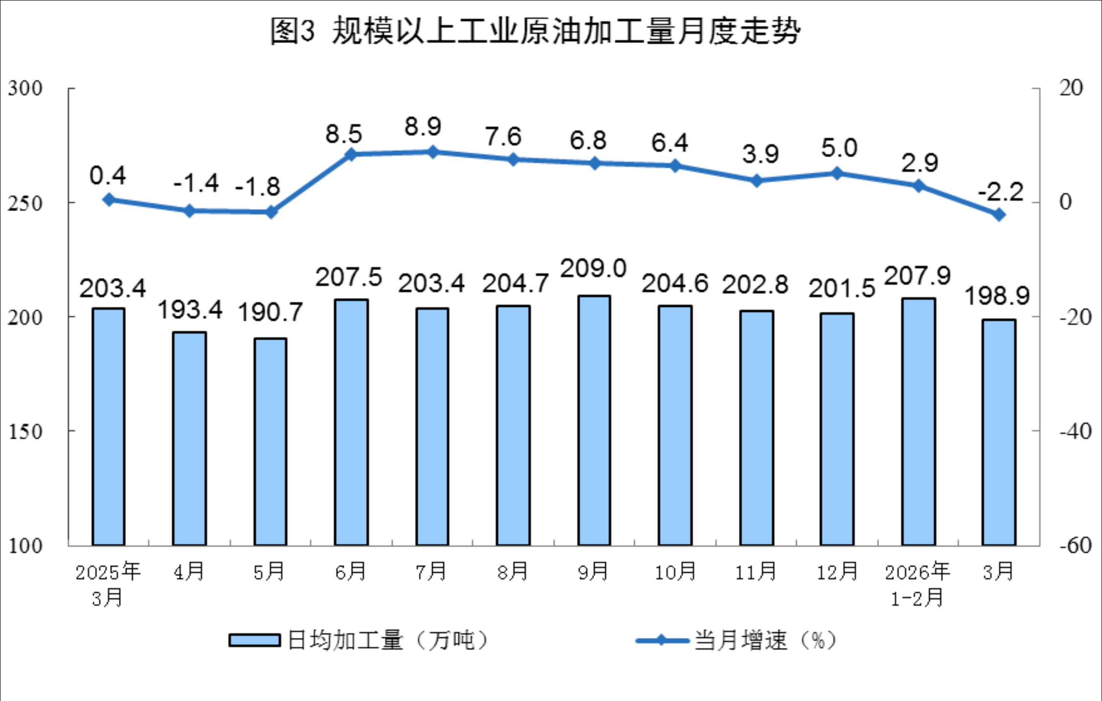 原油加工由增轉(zhuǎn)降。3月份,規(guī)上工業(yè)原油加工量6167萬噸,同比下降2.2%;日均加工198.9萬噸。