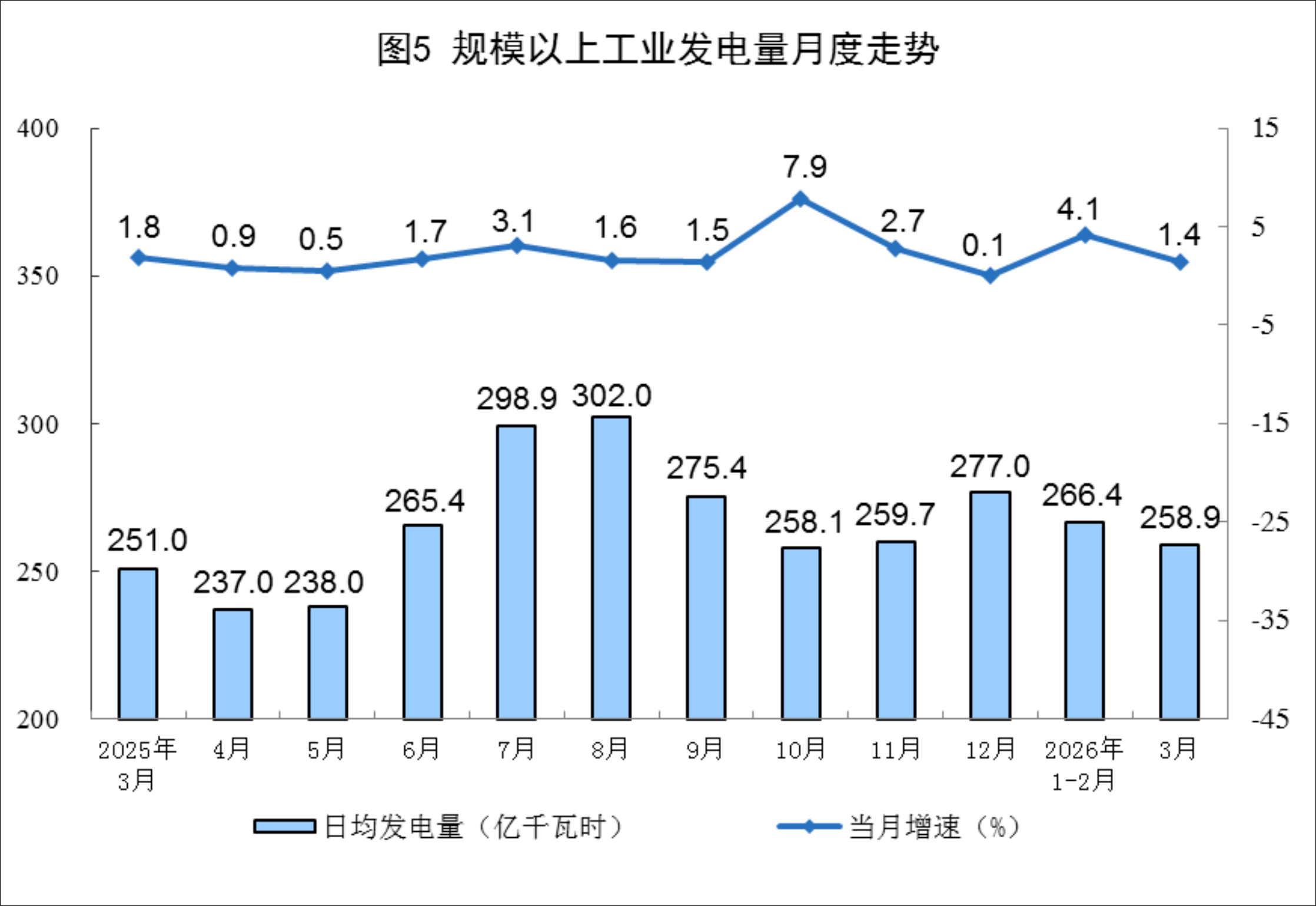 規(guī)上工業(yè)電力生產(chǎn)穩(wěn)定增長。3月份,規(guī)上工業(yè)發(fā)電量8025億千瓦時,同比增長1.4%,增速比1—2月份回落2.7個百分點;日均發(fā)電258.9億千瓦時。1—3月份,規(guī)上工業(yè)發(fā)電量23782億千瓦時,同比增長3.4%。