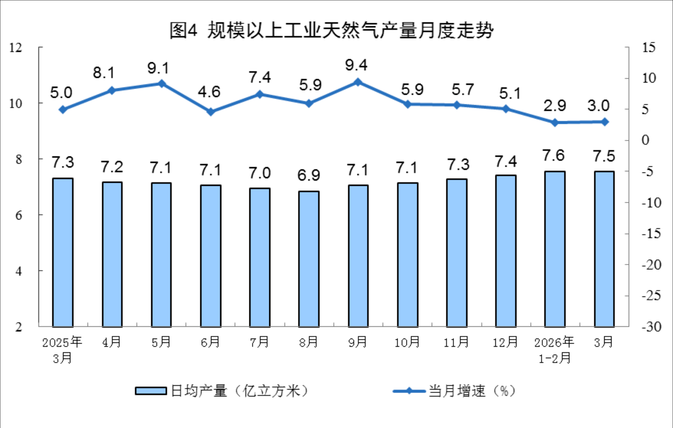 天然氣生產(chǎn)增速加快。3月份,規(guī)上工業(yè)天然氣產(chǎn)量234億立方米,同比增長3.0%,增速比1—2月份加快0.1個百分點;日均產(chǎn)量7.5億立方米。