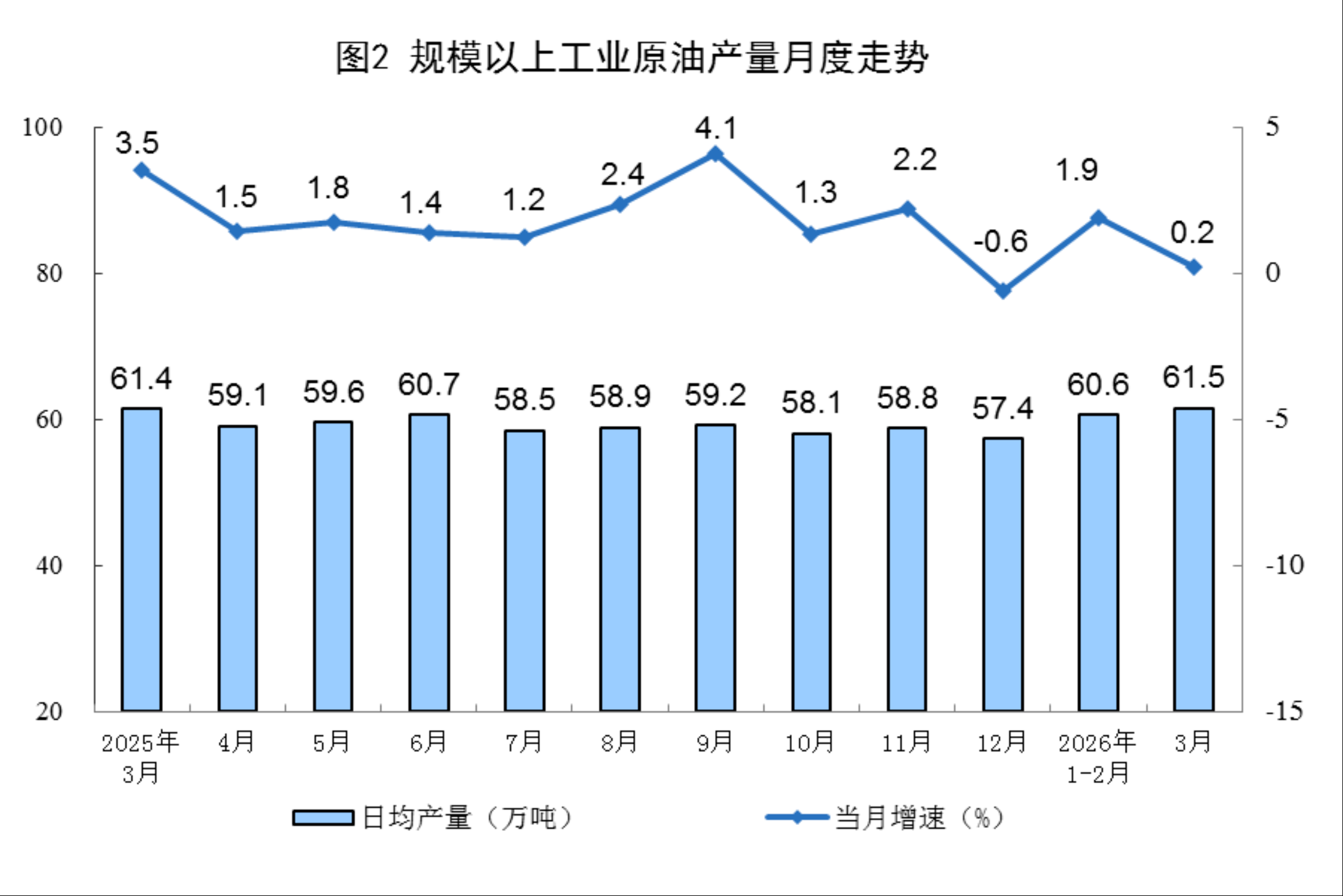 原油生產(chǎn)保持增長。3月份,規(guī)上工業(yè)原油產(chǎn)量1907萬噸,同比增長0.2%;日均產(chǎn)量61.5萬噸。