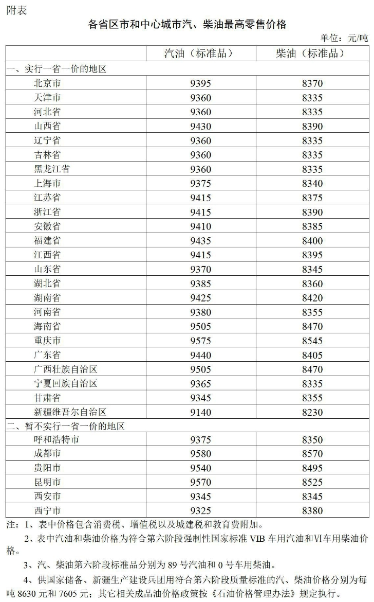 據(jù)國家發(fā)改委12月19日消息,根據(jù)近期國際市場油價變化情況,按照現(xiàn)行成品油價格形成機制,自2023年12月19日24時起,國內(nèi)汽、柴油價格(標(biāo)準(zhǔn)品,下同)每噸分別降低415元、400元。調(diào)整后,各?。▍^(qū)、市)和中心城市汽、柴油最高零售價格見附表。相關(guān)價格聯(lián)動及補貼政策按現(xiàn)行規(guī)定執(zhí)行。