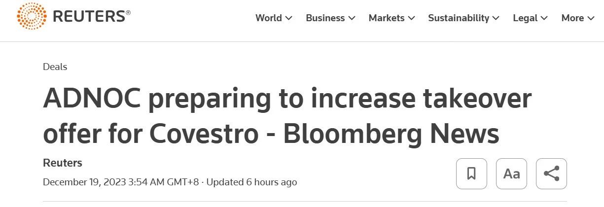 7月18日,有知情人士表示,ADNOC已將對科思創(chuàng)的收購報價提高至約110億歐元,這一新收購報價將科思創(chuàng)提高到每股約57歐元,ADNOC也希望借此說服科思創(chuàng)參與談判。