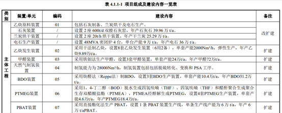主要建設36萬噸/年乙炔原料裝置、12萬噸/年乙炔發(fā)生裝置、28000標立方米/小時天然氣制氫裝置、72萬噸/年甲醛裝置、31.2萬噸/年BDO裝置(三套裝置產(chǎn)能為3×10.4萬噸/年)、18.4萬噸/年PTMEG裝置(四套裝置產(chǎn)能為4×4.6萬噸/年)、6萬噸/年PBAT裝置等。
