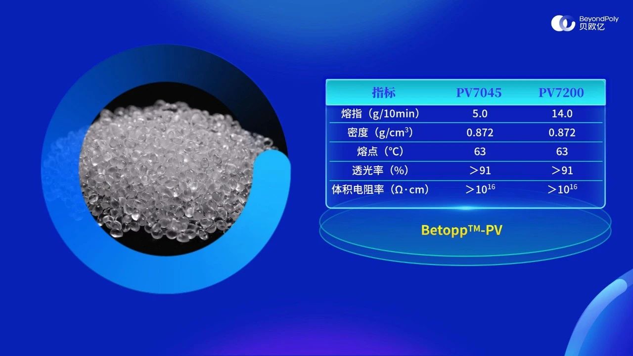 貝歐億推出的BetoppTM系列聚烯烴彈性體(POE)采用具有自主知識產(chǎn)權(quán)的連續(xù)溶液聚合工藝生產(chǎn)而成,其中面向光伏膠膜行業(yè)的產(chǎn)品為BetoppTM-PV系列,具體包括PV7045和PV7200兩款產(chǎn)品。