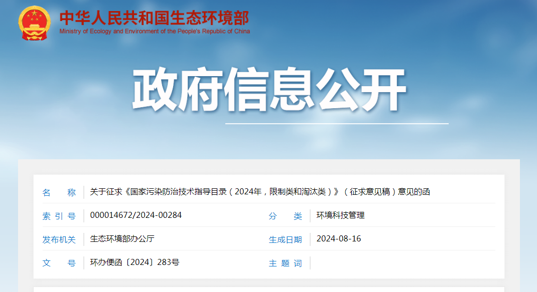 為更好發(fā)揮技術(shù)指導(dǎo)作用,推動(dòng)生態(tài)環(huán)境領(lǐng)域設(shè)備更新和技術(shù)進(jìn)步,生態(tài)環(huán)境部日前發(fā)布關(guān)于征求《國家污染防治技術(shù)指導(dǎo)目錄(2024年,限制類和淘汰類)》(征求意見稿)意見的函,向有關(guān)單位征求意見。
