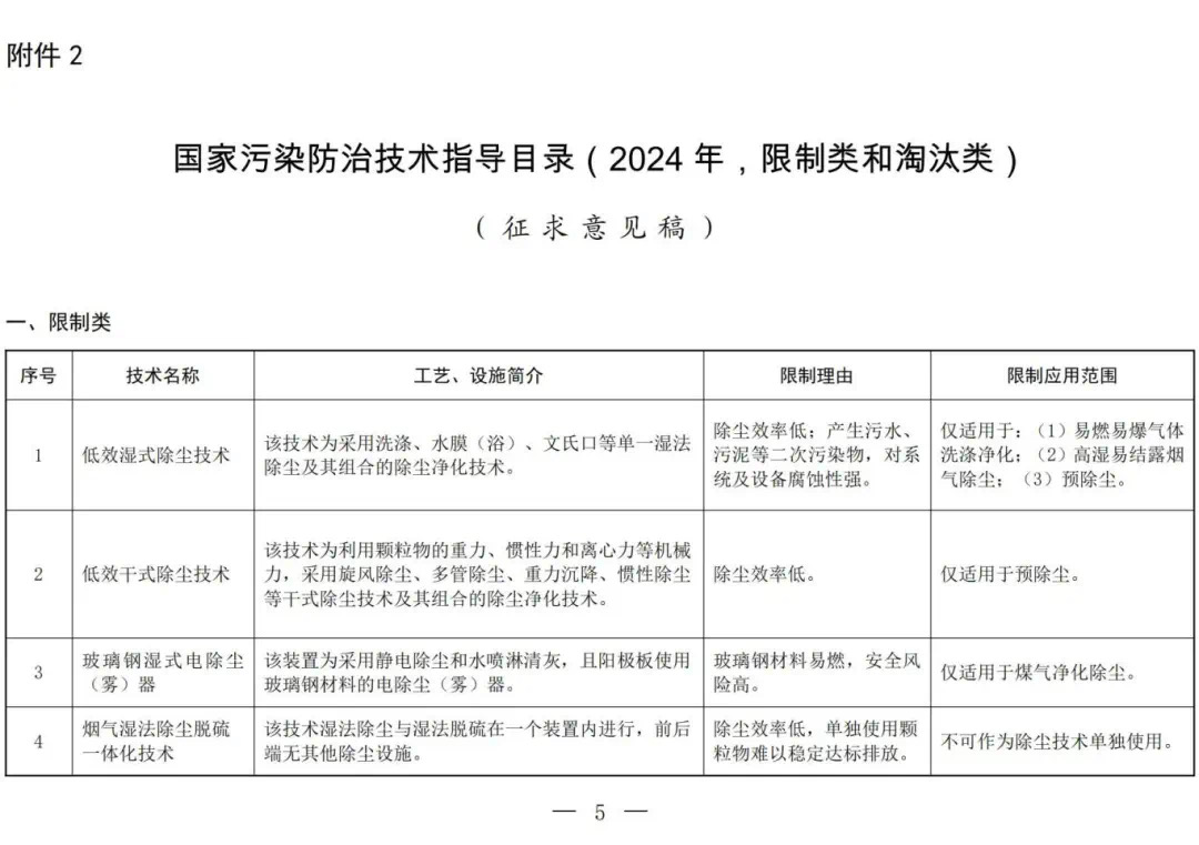 生態(tài)環(huán)境部發(fā)布《國家污染防治技術(shù)指導(dǎo)目錄(2024年,限制類和淘汰類)》(征求意見稿)