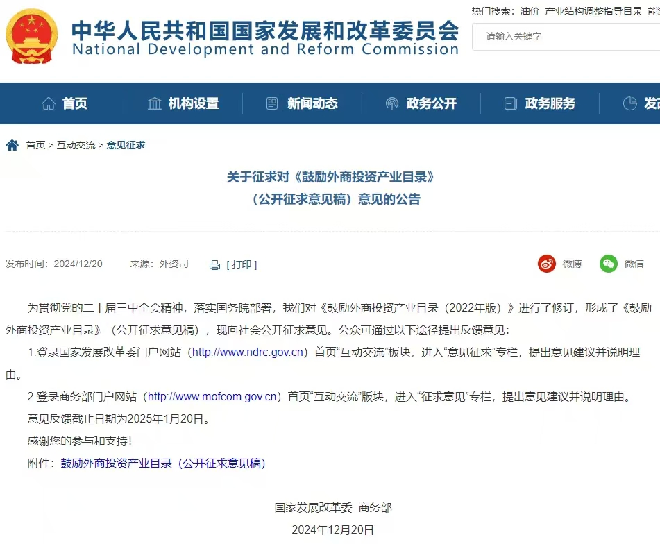 12月20日,國家發(fā)改委官網(wǎng)發(fā)布關(guān)于征求對《鼓勵外商投資產(chǎn)業(yè)目錄》(公開征求意見稿)意見的公告。