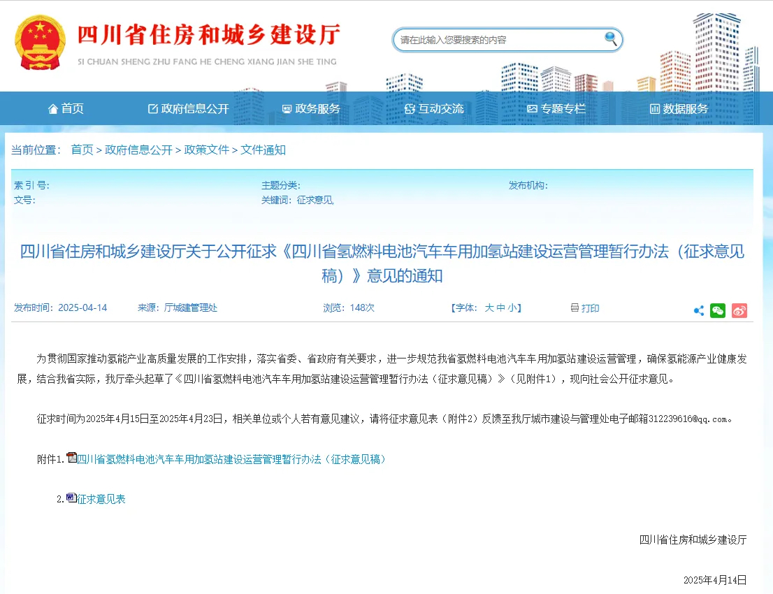 4月14日,四川省住房和城鄉(xiāng)建設廳官網(wǎng)發(fā)布關于公開征求《四川省氫燃料電池汽車車用加氫站建設運營管理暫行辦法(征求意見稿)》意見的通知。