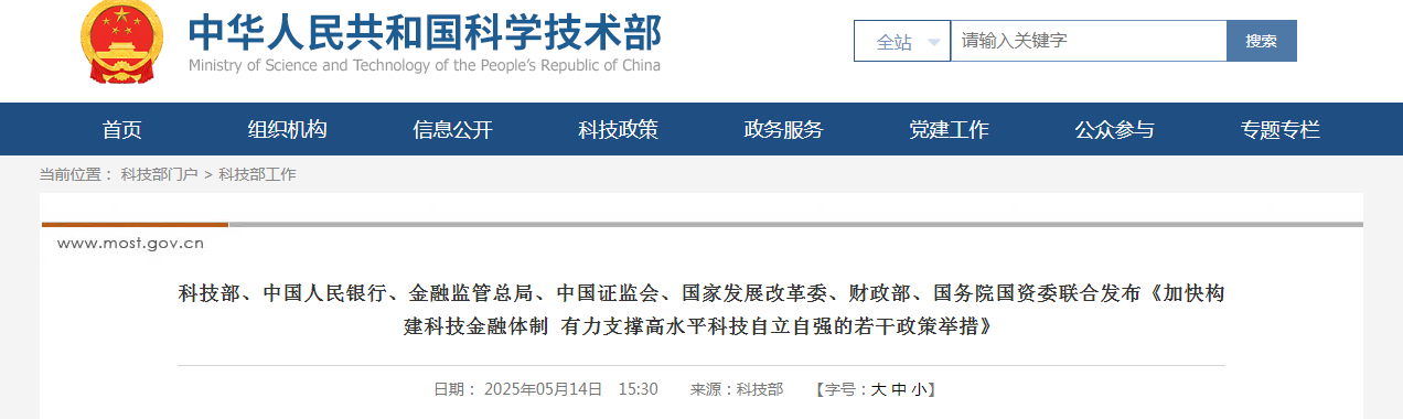 為深入貫徹黨的二十大、二十屆三中全會精神,認真落實全國科技大會、中央金融工作會議部署,構(gòu)建同科技創(chuàng)新相適應(yīng)的科技金融體制,加強對國家重大科技任務(wù)和科技型中小企業(yè)的金融支持,科技部、中國人民銀行、金融監(jiān)管總局、中國證監(jiān)會、國家發(fā)展改革委、財政部、國務(wù)院國資委聯(lián)合制定了《加快構(gòu)建科技金融體制 有力支撐高水平科技自立自強的若干政策舉措》?,F(xiàn)印發(fā)給你們,請遵照執(zhí)行。