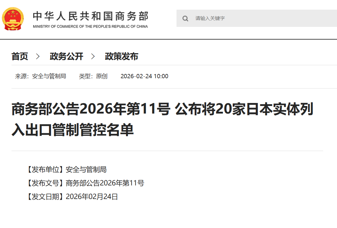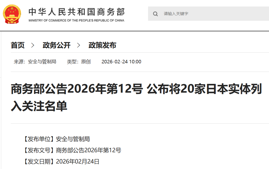 2月24日,商務(wù)部公告稱,將20家日本實(shí)體列入出口管制管控名單,同日公告將20家日本實(shí)體列入關(guān)注名單,其中包括三菱材料株式會(huì)社等。