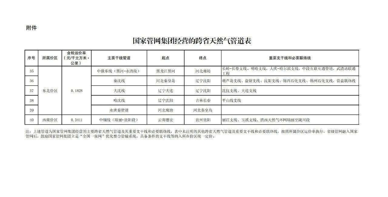 根據《天然氣管道運輸價格管理辦法(暫行)》和《天然氣管道運輸定價成本監(jiān)審辦法(暫行)》(發(fā)改價格規(guī)〔2021〕818號)有關規(guī)定,我委對國家石油天然氣管網集團有限公司經營的跨省(自治區(qū)、直轄市)天然氣管道進行了定價成本監(jiān)審,并據此核定了西北、東北、中東部及西南四個價區(qū)管道運輸價格?,F(xiàn)就有關事項通知如下。