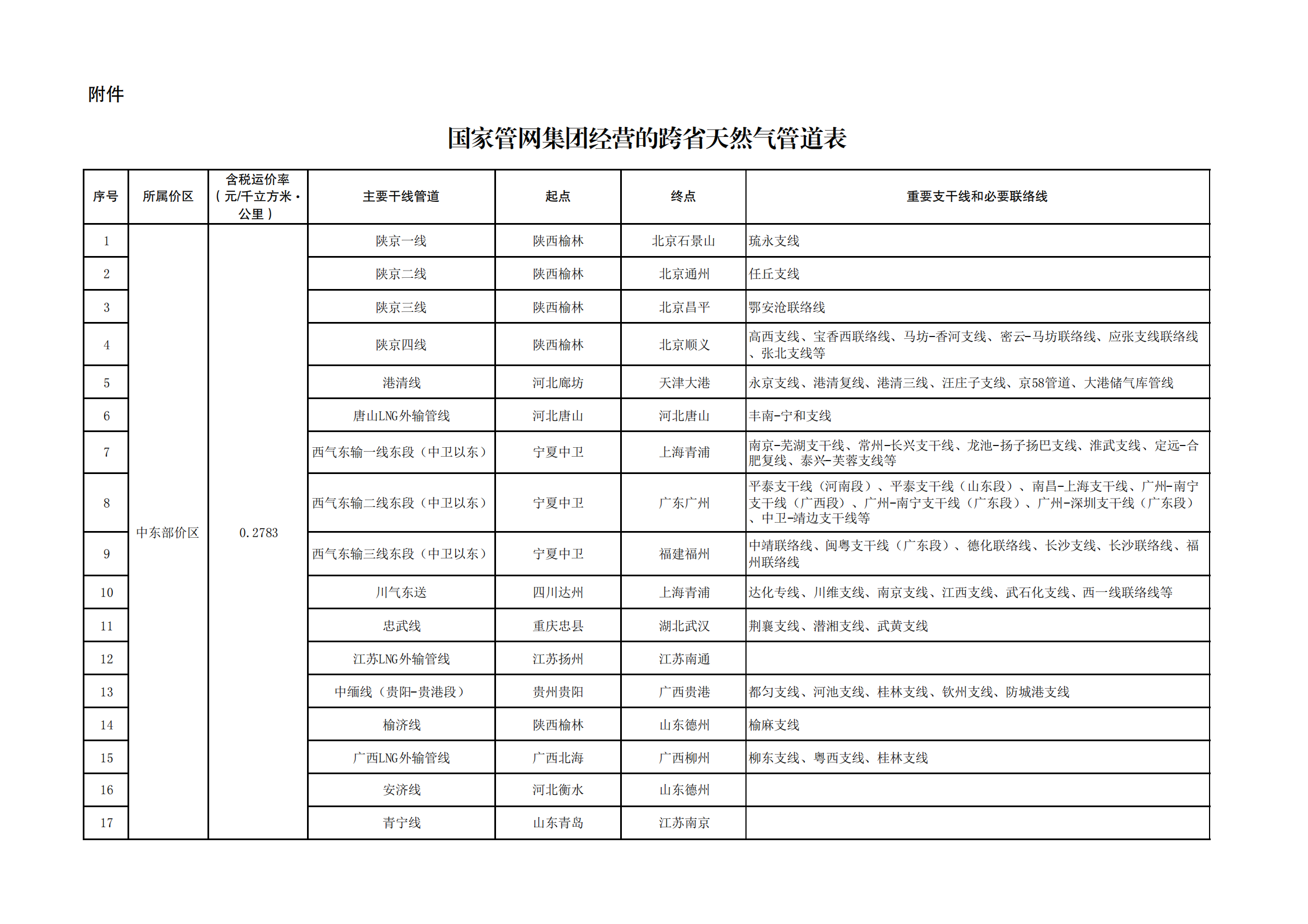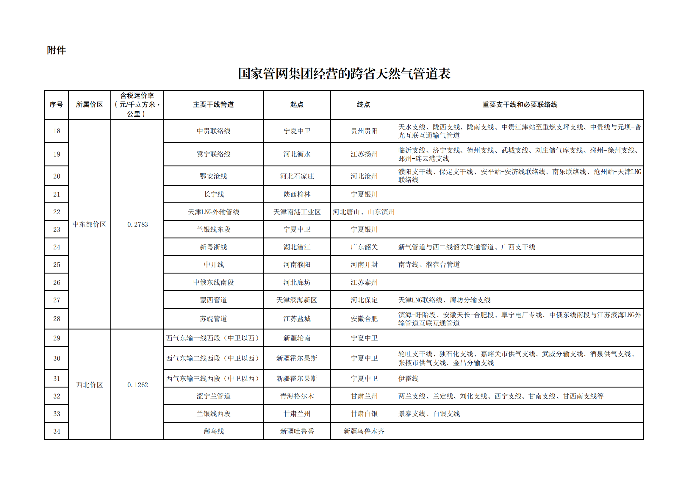 一、核定西北價區(qū)運價率為0.1262元/千立方米·公里(含9%增值稅,下同),東北價區(qū)運價率為0.1828元/千立方米·公里,中東部價區(qū)運價率為0.2783元/千立方米·公里,西南價區(qū)運價率為0.3411元/千立方米·公里。